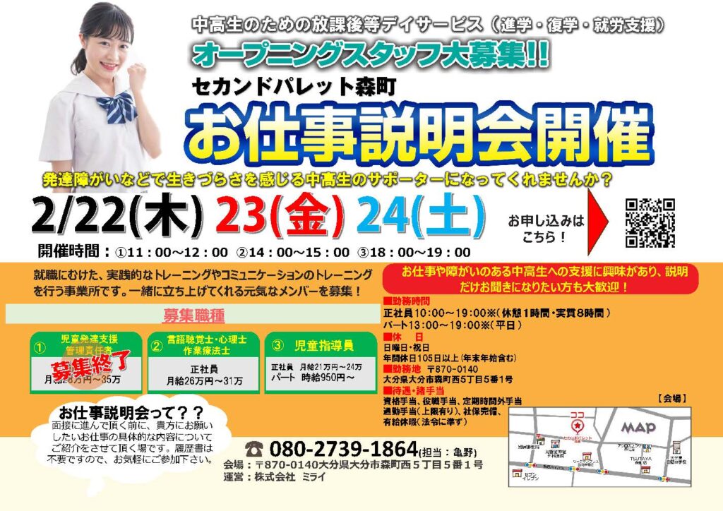 中高生のための放課後等デーサービス『セカンドパレット森町』が令和6年5月オープン予定です! お仕事説明会を 2/22(木)・23(金)・24(土)に開催いたします。 開催時間は、①11:00~12:00②14:00~15:00③18:00~19:00 です。 面接に進んでいただく前に、お仕事の具体的な内容についてご紹介させて頂く場です。履歴書は不要ですので、お気軽にご参加ください。 お仕事や障がいのある中高生への支援に興味があり、説明だけお聞きになりたい方も大歓迎です。